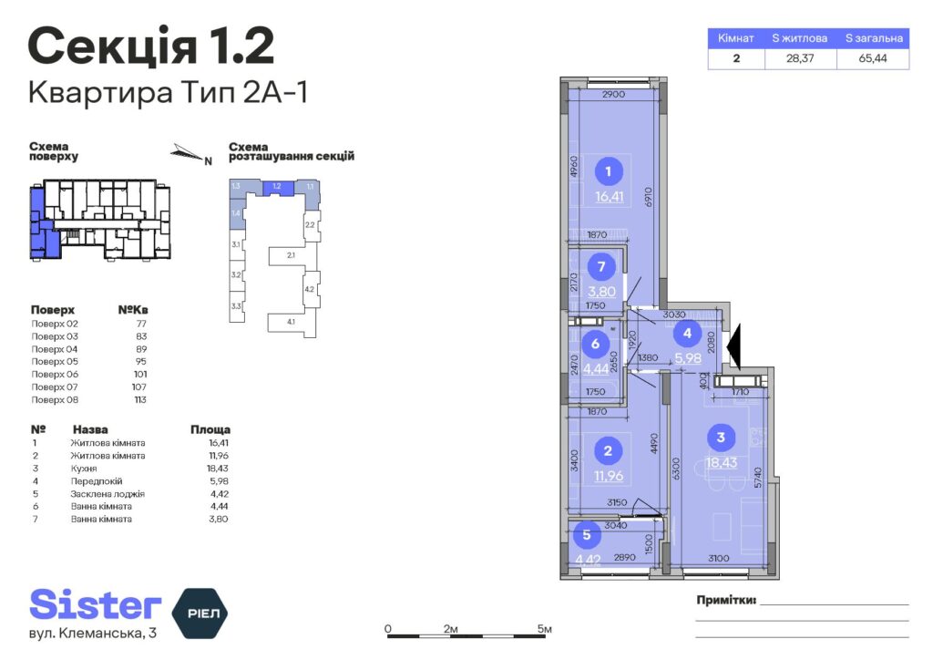 Планування 2-кімнатної квартири: №113, 65.44 м²