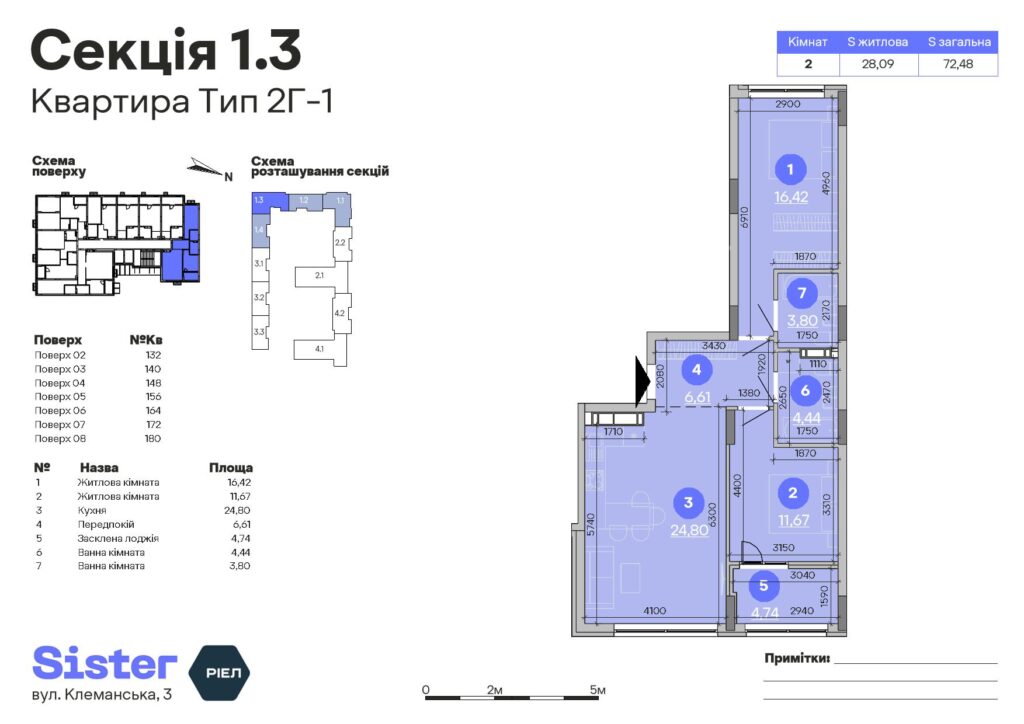 Планування 2-кімнатної квартири: №156, 72.48 м²