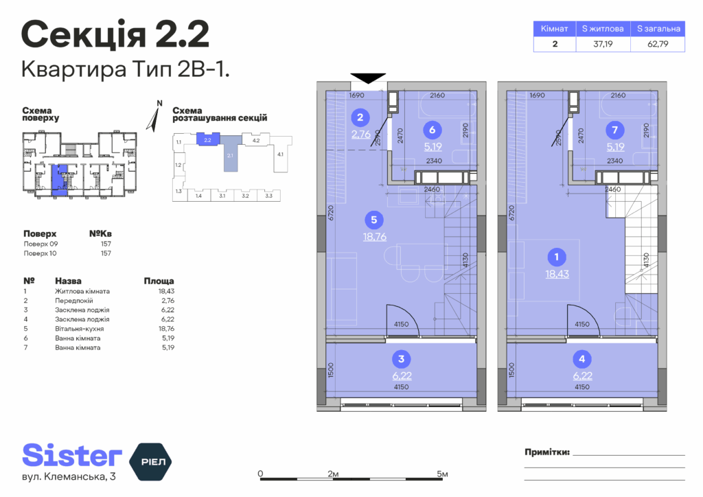 Планування 2-кімнатної квартири: №157, 62.79 м²