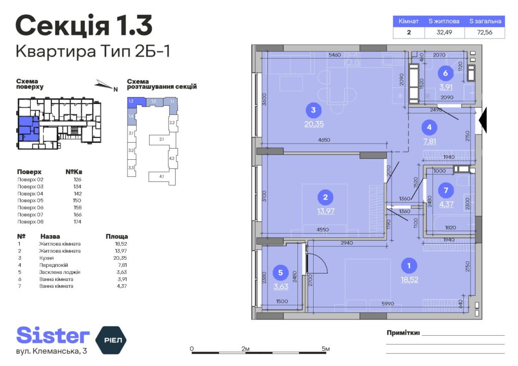 Планування 2-кімнатної квартири: №174, 72.56 м²