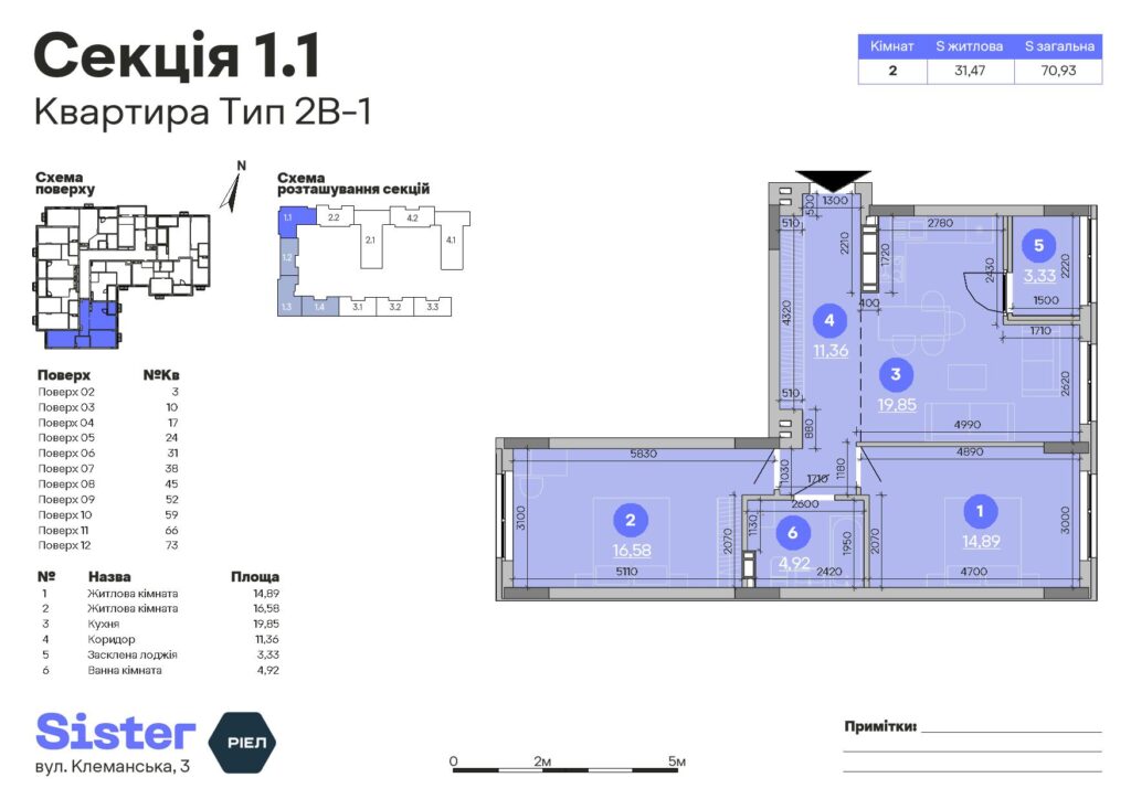 Планування 2-кімнатної квартири: №66, 70.93 м²
